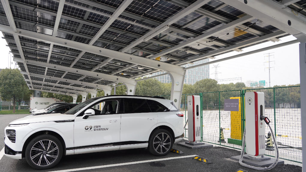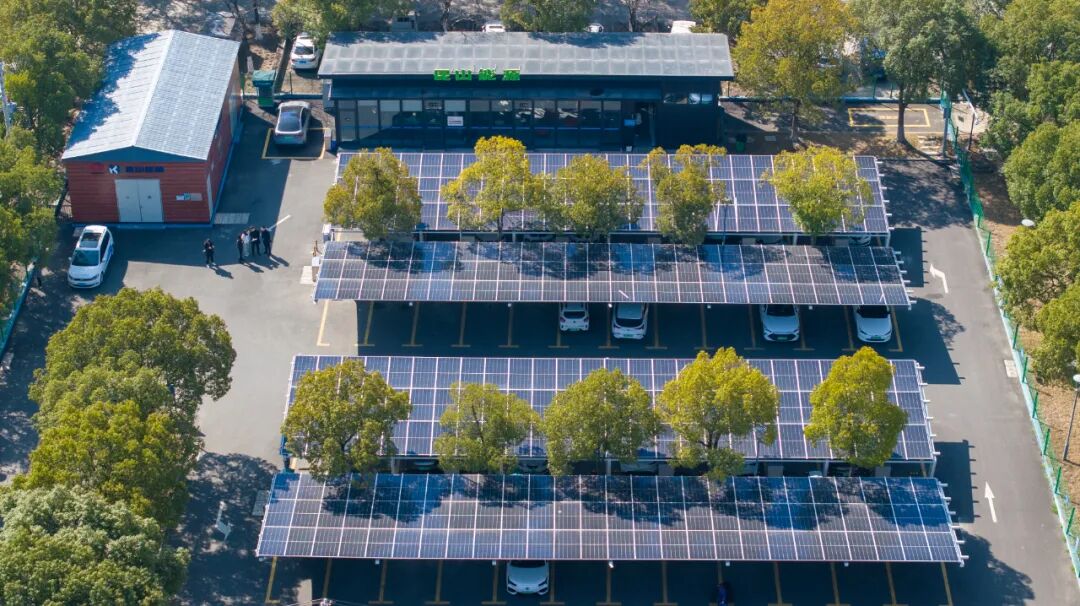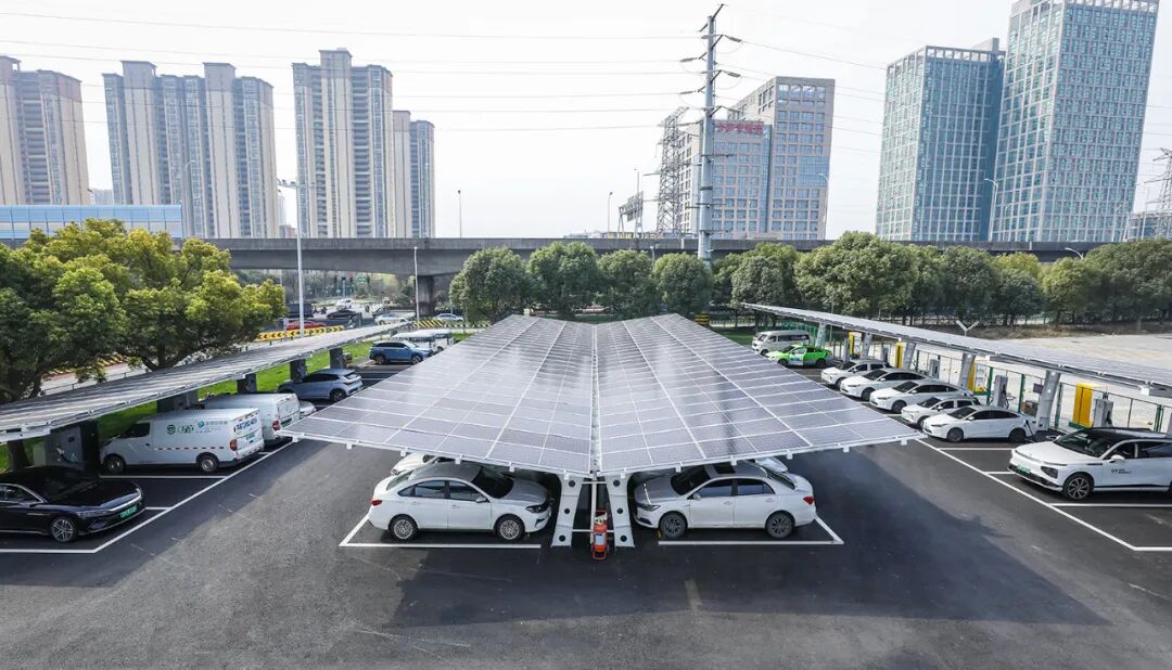 充電站頂棚鋪設(shè)的光伏發(fā)電板