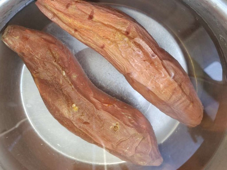 用隔熱手套或者夾子之類的,把烤盤里的紅薯放入提前備好的涼水里(純凈水或者直飲水),浸大約一分鐘左右,皮微微皺起來就行了。