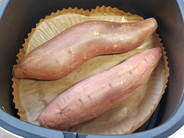 蜜薯洗干凈后,不用擦水,直接放入預(yù)熱后的空氣炸鍋,200度烤了25分鐘(今天烤的圖一的蜜薯大點(diǎn),圖二中的是中號(hào)的,20分鐘就夠了)。